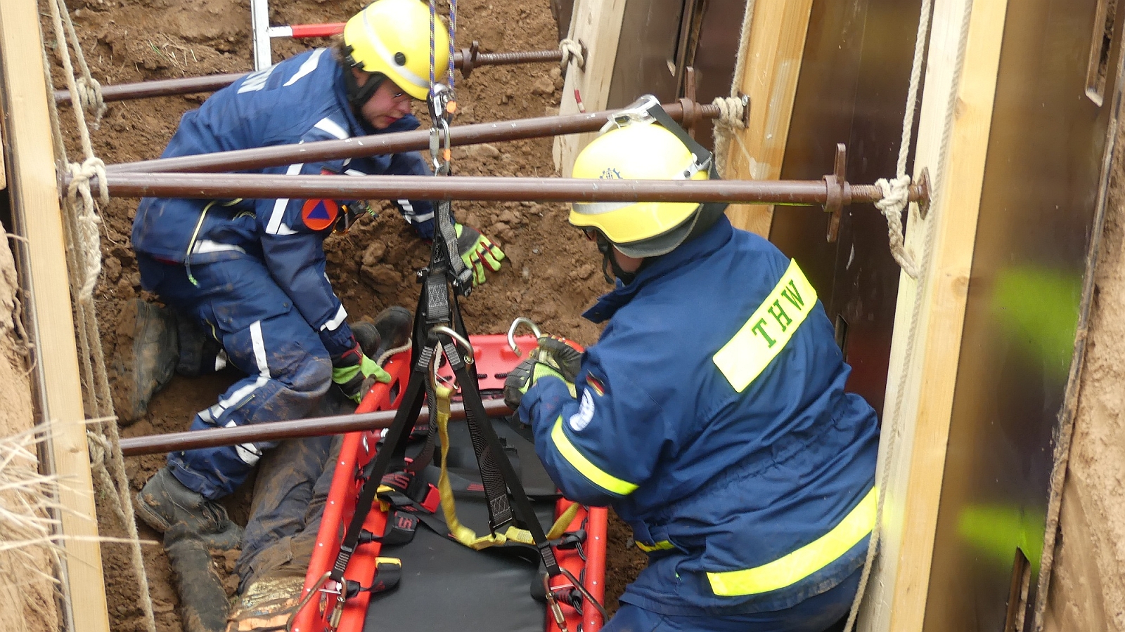 Wenig später: Auf dem Gelände eines Kiesabbaubetriebes ist ein Fußgänger in eine Grube gestürzt, die Abbruchkante droht nachzusacken. Einsatz für den Tiefbau-Rettungssatz des THW: Mit speziellen Spundwänden und Streben sichern die Helfer die Grube, bis die Drehleiter der Feuerwehr den „Verletzten“ auf einem Schleifkorb heben kann.