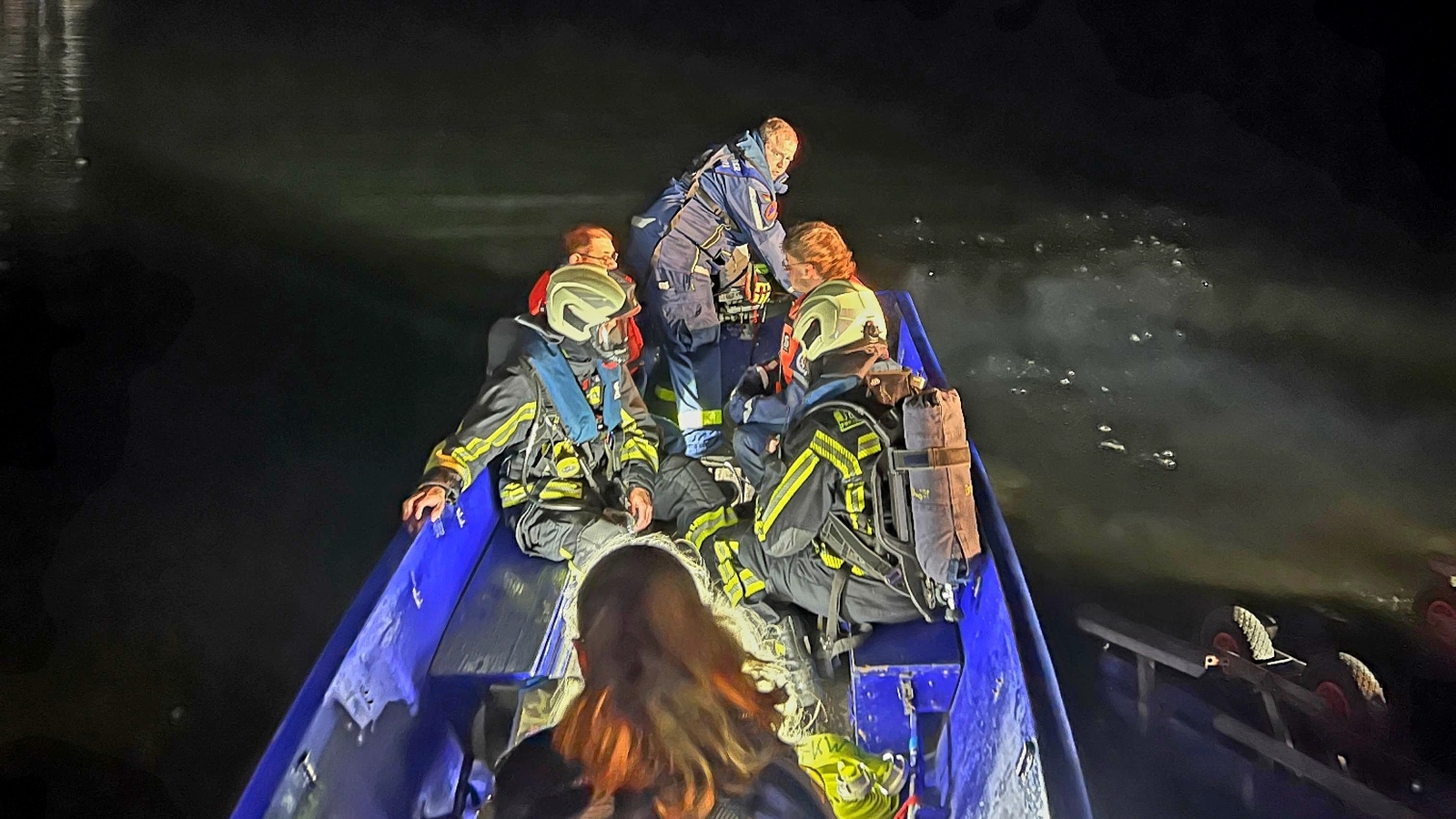 Station 2: Großer Freizeitsee, Nordhafen, gegen 23 Uhr: Zeugen melden ein brennendes Boot. Kurz danach mehrere Personen im Wasser – stockdunkel. Mit Mehrzweckbooten erkundet das THW die Lage und startet zusammen mit der Feuerwehr einen Erstangriff auf das Feuer, realitätsnah simuliert durch ein rauchendes Ölfass auf einem Ponton. Aufgrund der vermissten Personen wurde die DLRG zur Unterstützung mit zwei Booten, Rettungsschwimmern und Strömungsrettern unter Leitung von Heiko Ude nachalarmiert. Parallel dazu leuchtete das THW den Uferbereich aus und setzte die Suche an Land fort.
