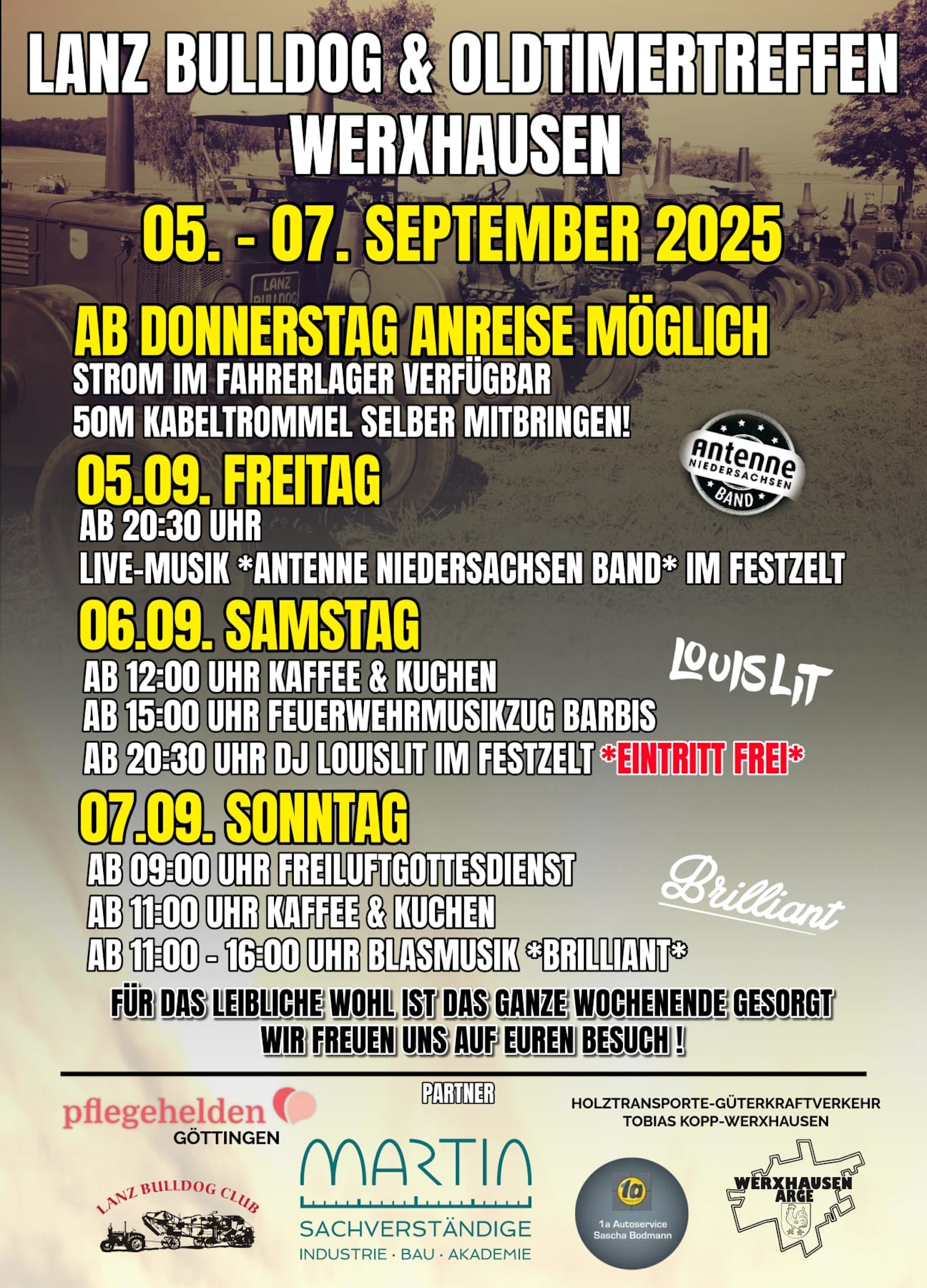 Für das leibliche Wohl sowie ein buntes Rahmenprogramm sorgt die AG Werxhausen Vereine. Bereits am Donnerstag ist eine Anreise möglich, offiziell startet das Treffen am Freitagabend. Dann heizt die Radio Niedersachsen Live-Band im Festzelt den Gästen ein.