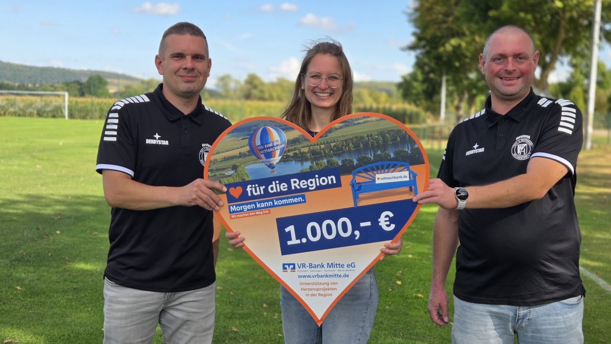Zur symbolischen Übergabe trafen sich Vertreter des Vereins und der Bank auf dem Sportgelände. Der erste Vorsitzende Lukas Leifheit sowie Schriftwart Tobias Grothey bedankten sich herzlich bei Julia Niesmann, Vertreterin der Volksbank Mitte eG, für das Engagement und die Unterstützung des Vereinslebens vor Ort.