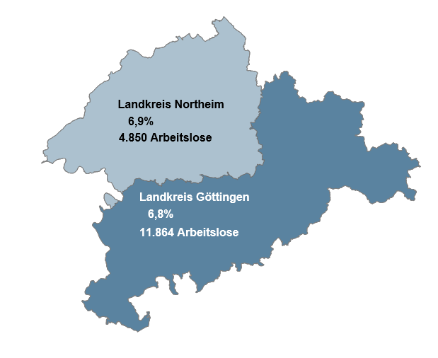 Die Arbeitslosigkeit ist im Landkreis Göttingen im August 2025 gestiegen. 11.864 Menschen waren arbeitslos gemeldet, 319 Personen mehr (2,8 Prozent) als im Juli, aber 266 bzw. 2,2 Prozent weniger als vor einem Jahr. Die Arbeitslosenquote beträgt 6,8 Prozent und liegt 0,2 Prozentpunkte über dem Vormonatsniveau. Vor einem Jahr lag sie bei 7 Prozent. Im Rechtskreis SGB III (Agentur für Arbeit) lag die Arbeitslosigkeit bei 3.805 Personen (4 Personen weniger als im Vormonat, aber 433 mehr als vor einem Jahr). Im Rechtskreis SGB II (Jobcenter) waren 8.059 Arbeitslose registriert (323 Personen mehr als im Vormonat, aber 699 weniger als vor Jahresfrist). Durch die Träger der Grundsicherung (Jobcenter) wurden 68 Prozent aller Arbeitslosen betreut.